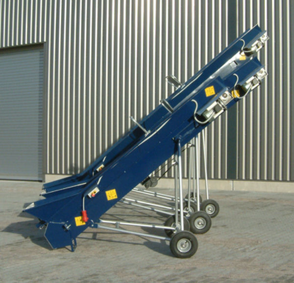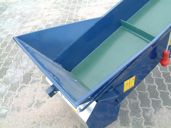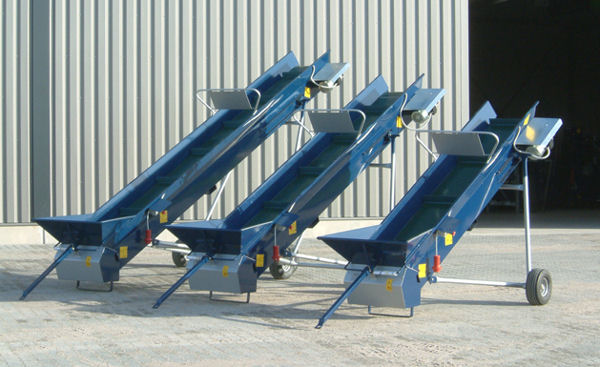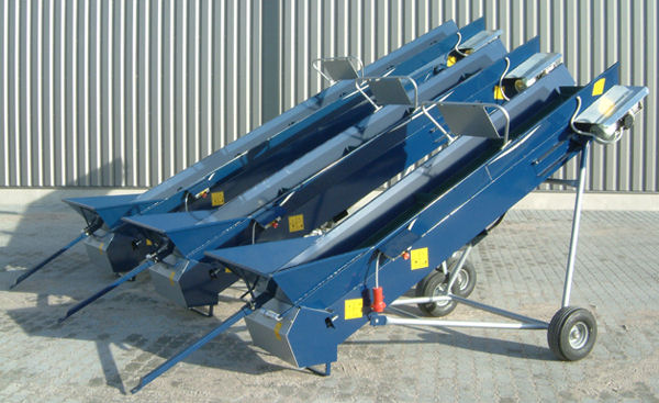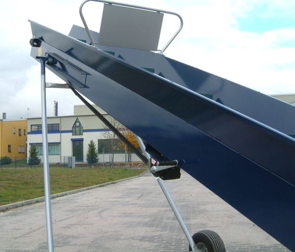 Längen von 3 m bis 8 m erhältlich und verfügen über einen großen Einfülltrichter. Alle Förderbänder sind in der Überwurfhöhe mittels Handkurbel verstellbar.